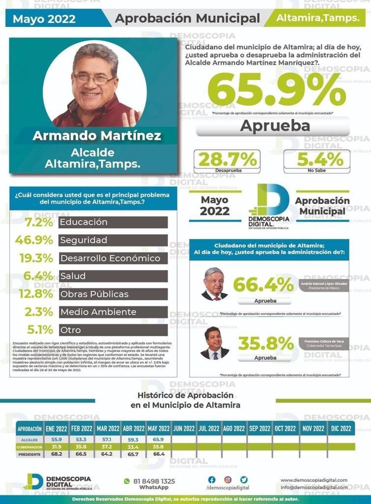 A pregunta expresa: ciudadano del municipio de Altamira; al día de hoy, ¿usted aprueba o desaprueba la administración del alcalde Armando Martínez Manríquez?; la respuesta a favor correspondió al 65.9 por ciento, posicionándolo como el presidente municipal mejor evaluado de Tamaulipas.