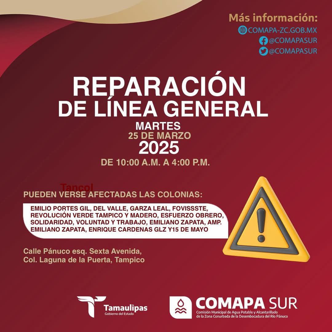 Pueden verse afectadas las colonias: Emilio Portes Gil, Del Valle, Garza Leal, Fovissste, Revolución Verde Tampico y Madero, Esfuerzo Obrero, Solidaridad, Voluntad y Trabajo, Emiliano Zapata, Amp. Emiliano Zapata, Enrique Cárdenas González y 15 de Mayo .