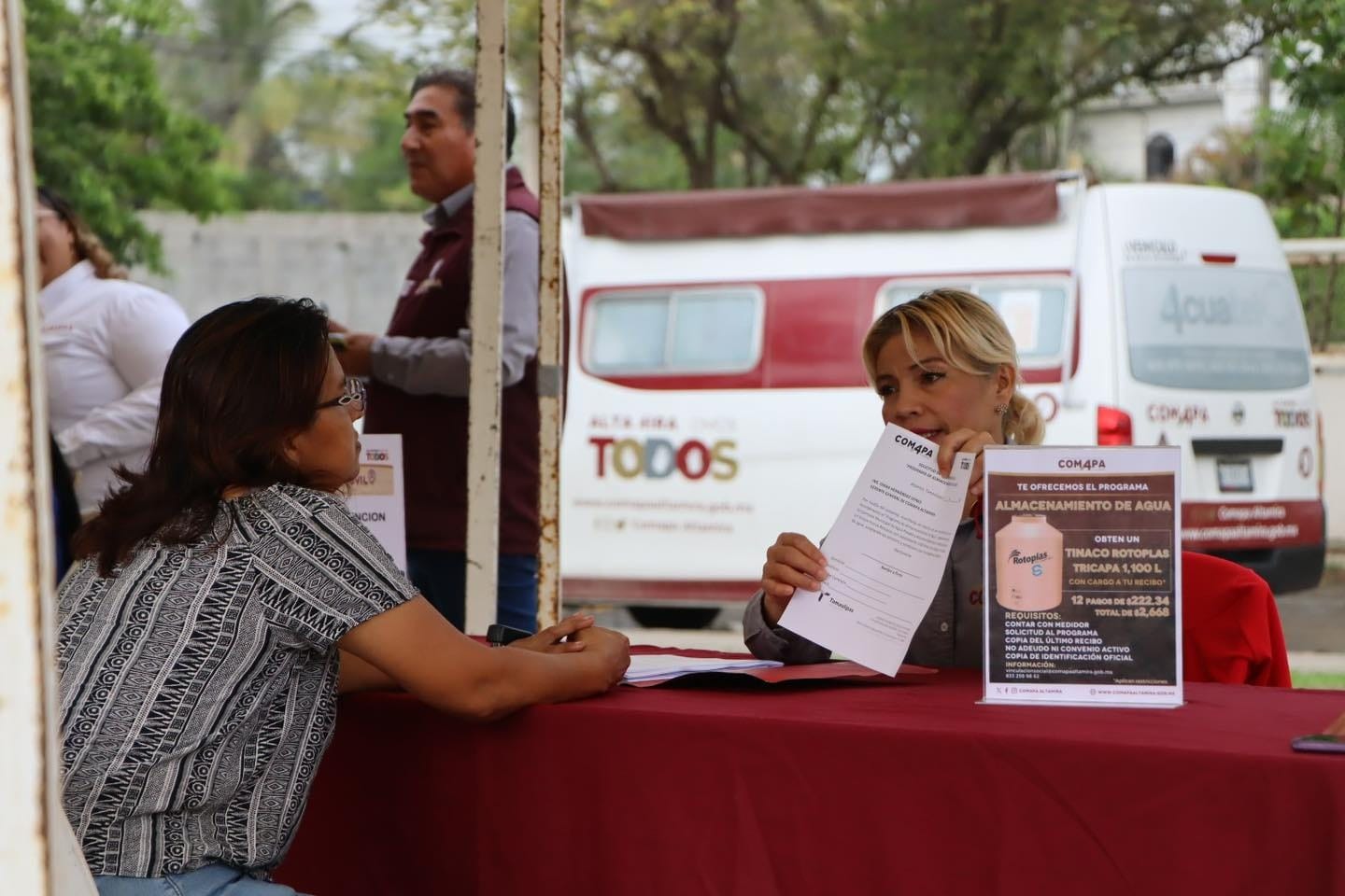 Uniendo esfuerzos con el Gobierno Municipal de Altamira, que preside el alcalde Dr. Armando Martínez Manríquez, la Comisión Municipal de Agua Potable y Alcantarillado de Altamira llevó a esa jornada una unidad COMAPA Móvil para facilitar a los usuarios el pago de su recibo y la elaboración de convenios.