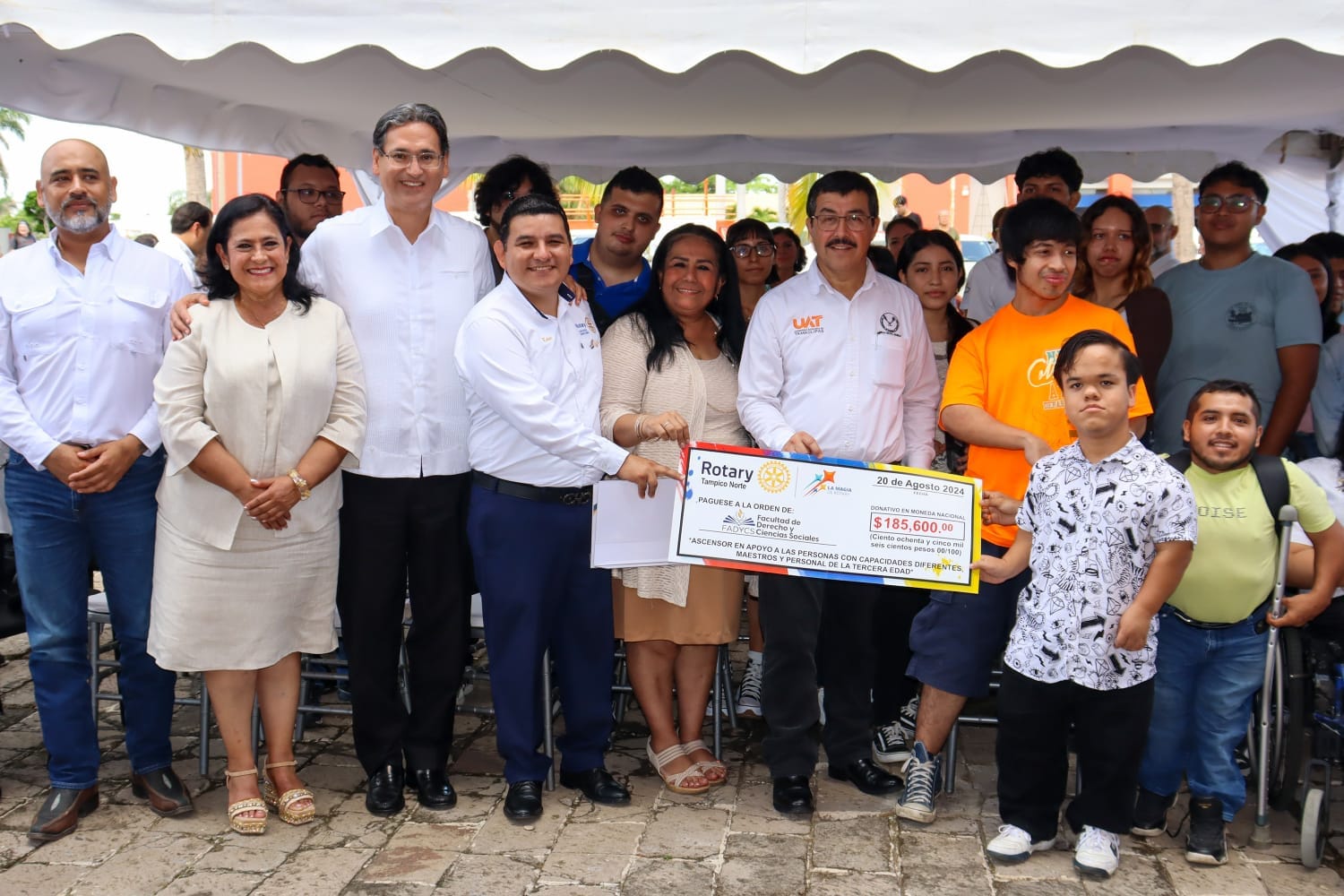 El rector recibió también el donativo económico que aportó el Club Rotario Tampico Norte para colaborar con la UAT en la construcción de esta obra, como parte de la vinculación que sostiene esta casa de estudios con el sector social y empresarial de la zona sur.