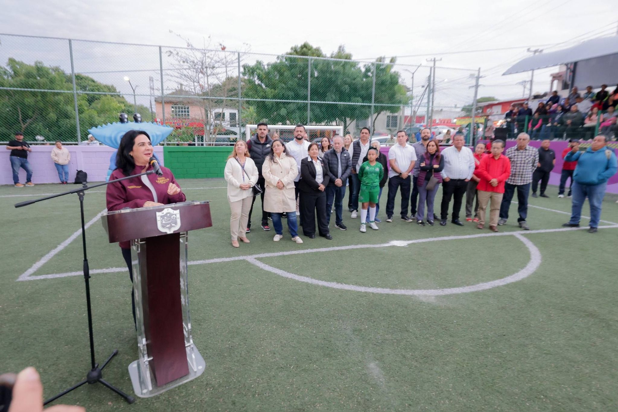 Mónica Villarreal detalló que, a través de la Dirección de Deportes, recientemente se llevó a cabo la renovación integral de la cancha de pasto sintético “Joaquín del Olmo”, en el sector Infonavit Cañada; así como la rehabilitación de las canchas en la colonia Otomí; la mejora de la galera de La Borreguera; la rehabilitación del pasto sintético en la cancha 18 de Marzo de la colonia Tamaulipas; y mejoras sustanciales en las canchas de la Petrolera y Lomas de Rosales.