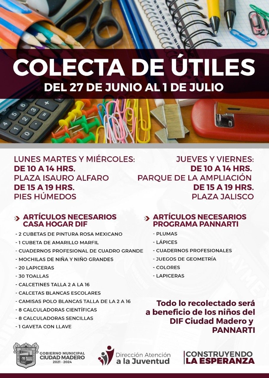 CD. MADERO, TAM.- Del 27 de junio al 1 de julio, el Gobierno de Ciudad Madero, a través de la Dirección de Atención a la Juventud, llevará a cabo una colecta de útiles escolares, con el propósito de apoyar a los niños de la Casa Hogar del Sistema DIF local y del Programa de Prevención y Atención del Trabajo Infantil (PANNARTI) en el regreso a clases.