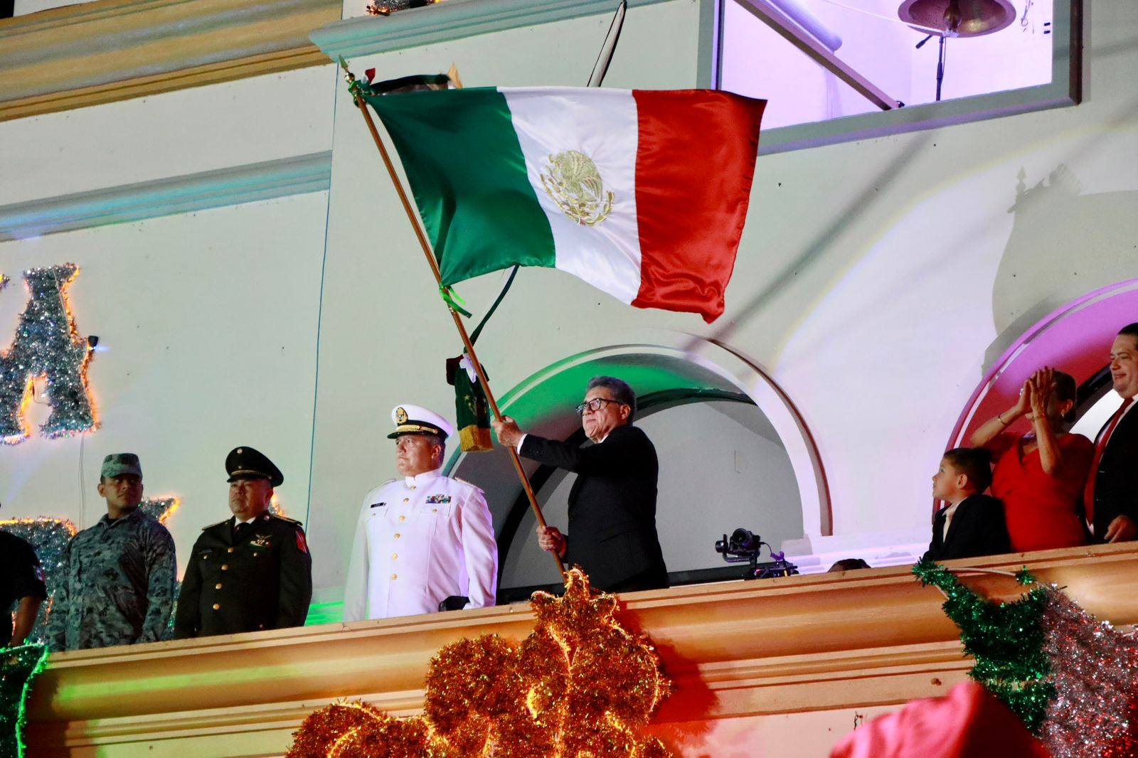 Más tarde, en la Presidencia Municipal, se realizó la ceremonia oficial del Grito de Independencia. En un acto solemne, el secretario del Ayuntamiento, José Francisco Pérez Ramírez, entregó la Bandera Nacional a la escolta del 15° Batallón de Infantería de la Secretaría de la Defensa Nacional, quienes a su vez la presentaron al presidente municipal.
