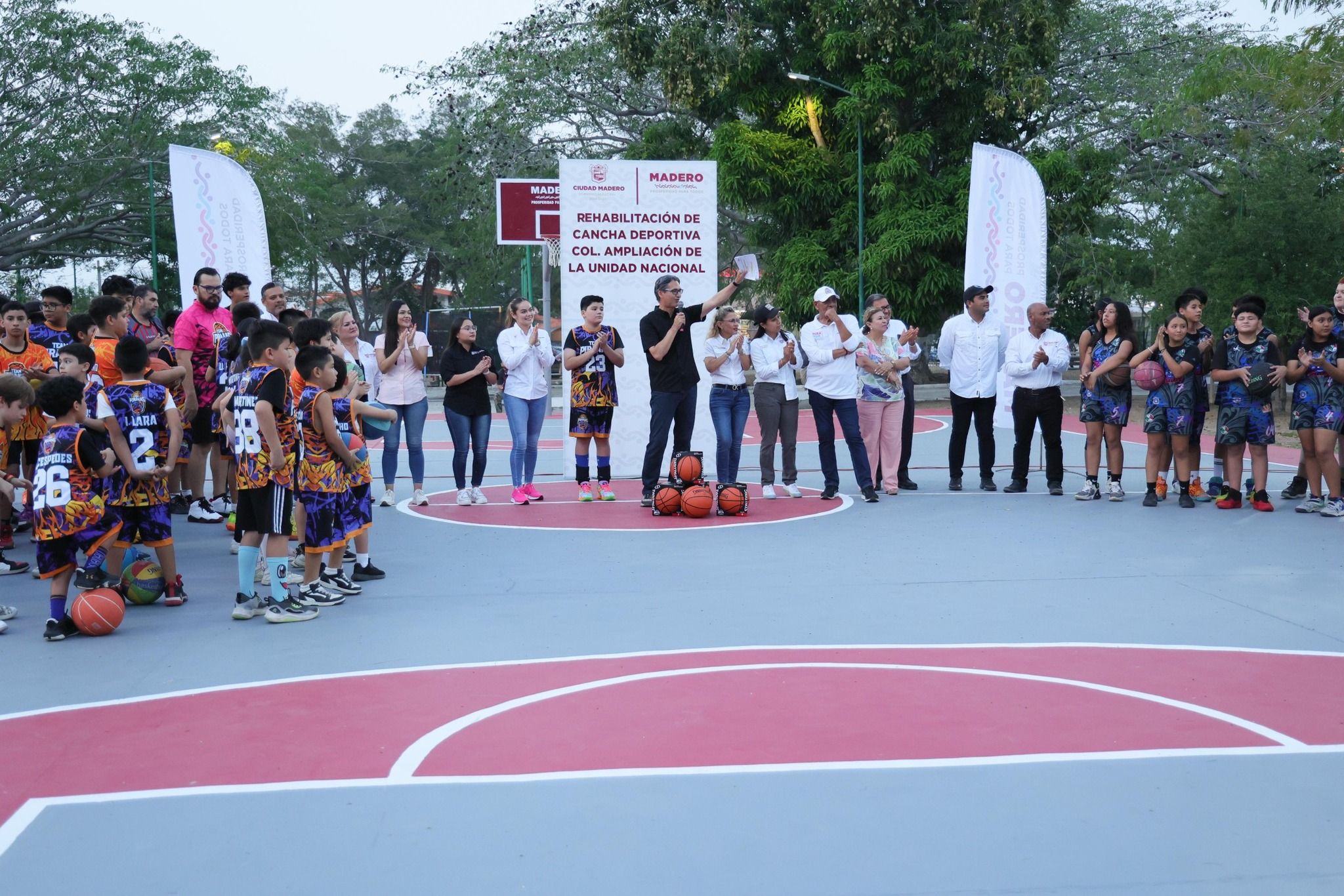 CD. MADERO TAMAULIPAS.- Con la entrega de la rehabilitación de la cancha de basquetbol del parque de la colonia Ampliación Unidad Nacional, el presidente municipal, Erasmo González Robledo cumple un compromiso más con los deportistas maderenses que a partir de ahora cuentan con instalaciones más dignas, seguras y mejor iluminadas.