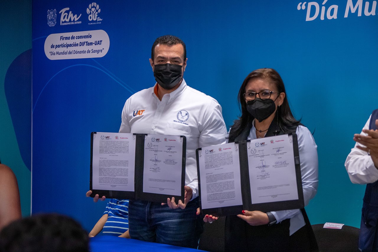 En la ceremonia realizada en el Centro Estatal de Trasfusión Sanguínea en Ciudad Victoria, que tuvo como marco el Día Mundial del Donante de Sangre, el C. P. Guillermo Mendoza Cavazos, Rector de la UAT, y la C. P. Diana Evelyn Mata Monreal, Directora General del DIF Tamaulipas, firmaron el acuerdo de participación, con la presencia de la Dra. Gloria Molina Gamboa, Secretaria de Salud de Tamaulipas.