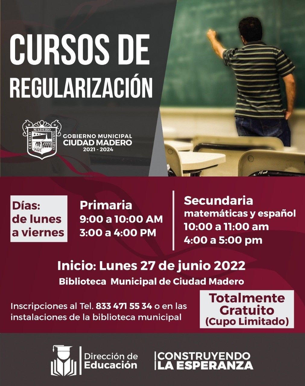 CD. MADERO, TAM.- Para fortalecer el aprendizaje y los programas de estudio de educación básica, el Gobierno de Ciudad Madero a través de la Dirección de Educación, impartirá cursos de regularización a estudiantes de primaria y secundaria que requieran reforzamiento en alguna materia.