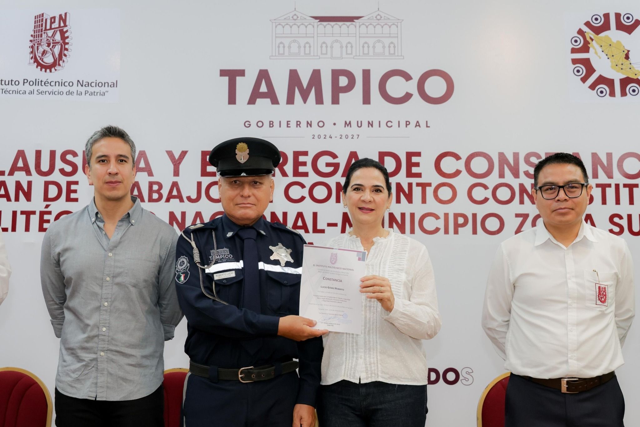 TAMPICO TAMAULIPAS.- En un hecho sin precedentes a nivel nacional, la presidenta municipal Mónica Villarreal Anaya encabezó la clausura del primer programa de capacitación integral para elementos de Tránsito de la zona conurbada, desarrollado en coordinación con el Instituto Politécnico Nacional (IPN), que benefició a 160 oficiales de Tampico, Ciudad Madero y Altamira.