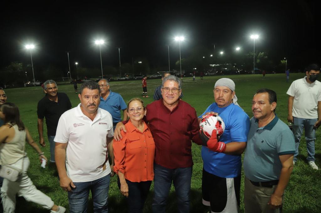 ALTAMIRA, TAM.- Un compromiso cumplido más en favor del deporte y la recuperación de plataformas para el sano esparcimiento fue lo que aconteció durante la inauguración de iluminación y rehabilitación de los campos de fútbol y béisbol de la Unidad Deportiva de Estación Esteros en Altamira, encabezada por el presidente municipal Mtro. Armando Martínez Manríquez.