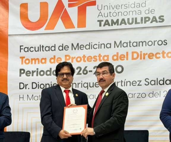 CD. VICTORIA TAMAULIPAS. – Reiterando el compromiso de fortalecer la calidad educativa y consolidar el liderazgo institucional, el rector de la Universidad Autónoma de Tamaulipas (UAT), Dámaso Anaya Alvarado, encabezó la toma de protesta del Dr. Dionisio Enrique Martínez Saldaña como director de la Facultad de Medicina Matamoros para el periodo 2026-2030.