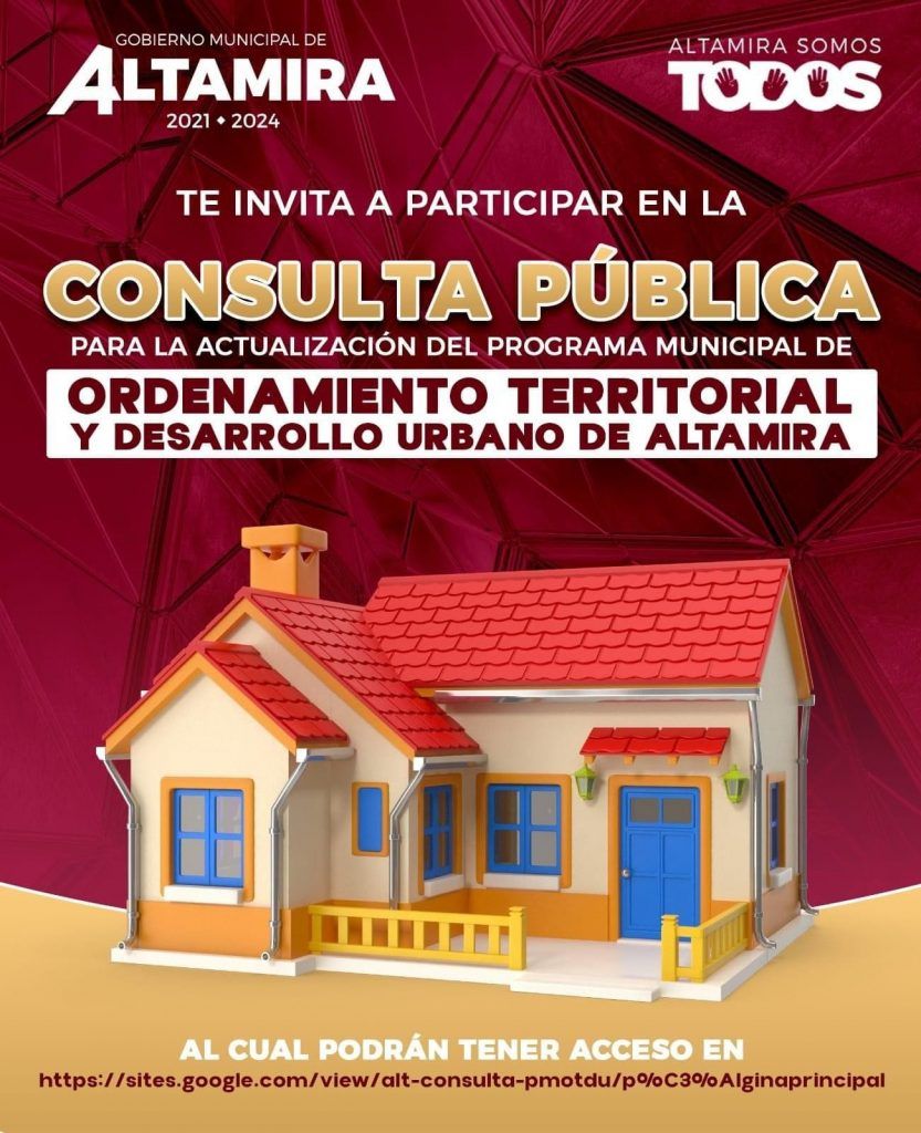 Altamira, Tamaulipas.- El R.Ayuntamiento de Altamira, que dirige el alcalde Dr. Armando Martínez Manríquez, hace extensiva la invitación a la comunidad de esta ciudad y puerto a ser partícipes de la consulta pública para la actualización del Programa Municipal de Ordenamiento Territorial y Desarrollo Urbano, misma que se encuentra organizando la Dirección de Desarrollo Urbano, que dirige el Arq. José Tomás Medrano Mayorga.