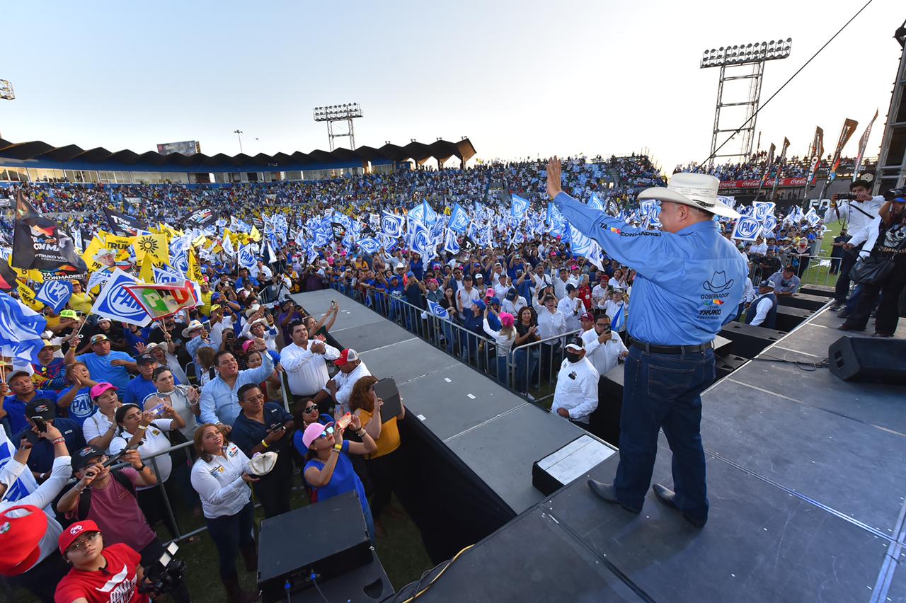 REYNOSA, TAM.- Ante miles de simpatizantes que abarrotaron  el estadio de béisbol “Adolfo López Mateos”, casa de los Broncos de Reynosa, César Truko Verástegui reiteró que llegó el momento de mandar un mensaje claro y contundente, “aquí en Tamaulipas somos nosotros los que decidimos nuestro destino, los que el 5 de junio, con nuestro voto, defenderemos nuestros sueños, juntos somos invencibles”.