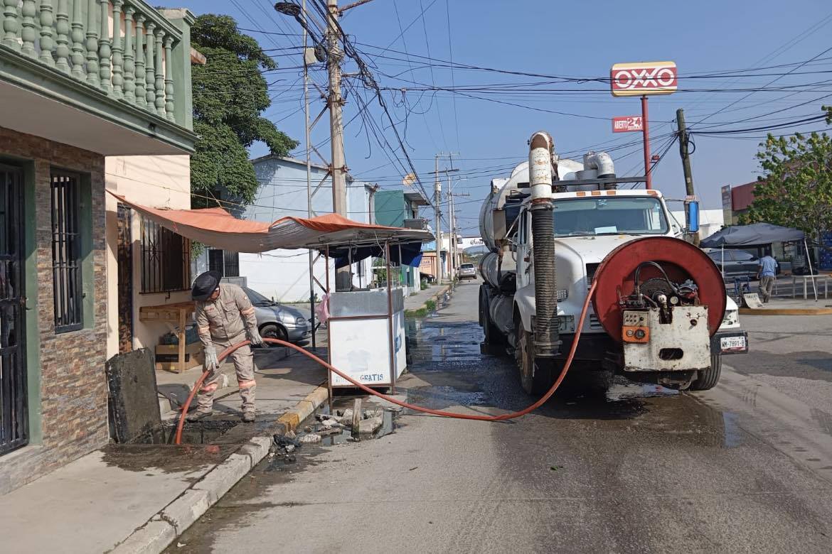 Y atendiendo reportes ciudadanos, personal de este organismo llevó a cabo la limpieza de registros en el Fraccionamiento Arecas, así como el sondeo en tuberías de desagüe azolvadas en las calles Tampico y Laguna de Miralta del Fraccionamiento Villas de Champayán, donde también se utilizaron unidades de presión y vacío.