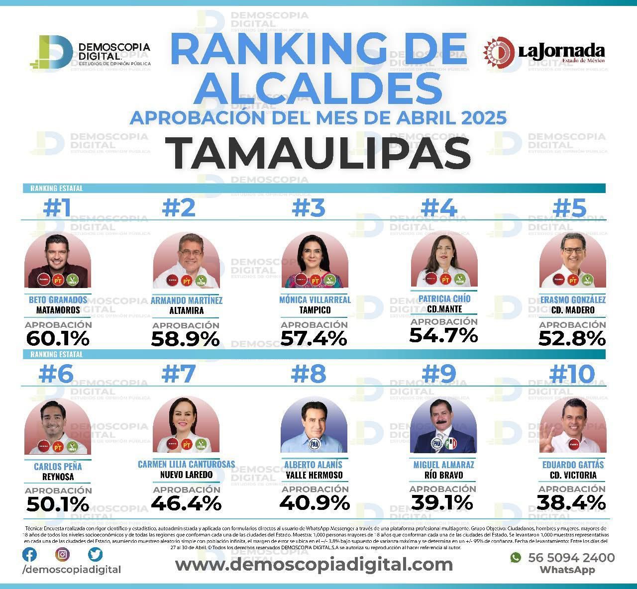 TAMPICO TAMAULIPAS.- La Presidenta municipal de Tampico, Mónica Villarreal Anaya, fue reconocida como la alcaldesa mejor evaluada del estado de Tamaulipas, de acuerdo con la medición realizada por la casa encuestadora Demoscopia Digital correspondiente al mes de abril de 2025. A nivel nacional, la presidenta también se posicionó en el lugar número 20 dentro del ranking de las 20 alcaldesas de Morena mejor evaluadas en todo el país.