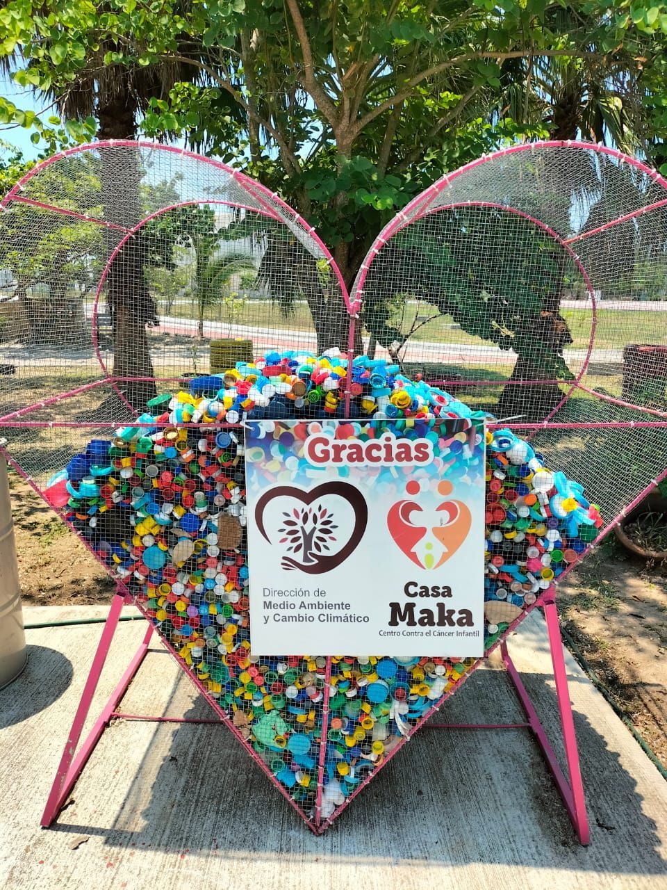 La estructura en forma de corazón se encuentra colocada en el Centro Educativo Ecología Ambiental al interior del parque Bicentenario, donde la ciudadanía puede acudir a depositar las tapas de plástico de botellas de diferentes líquidos, como refresco, agua y jugo, entre otras.