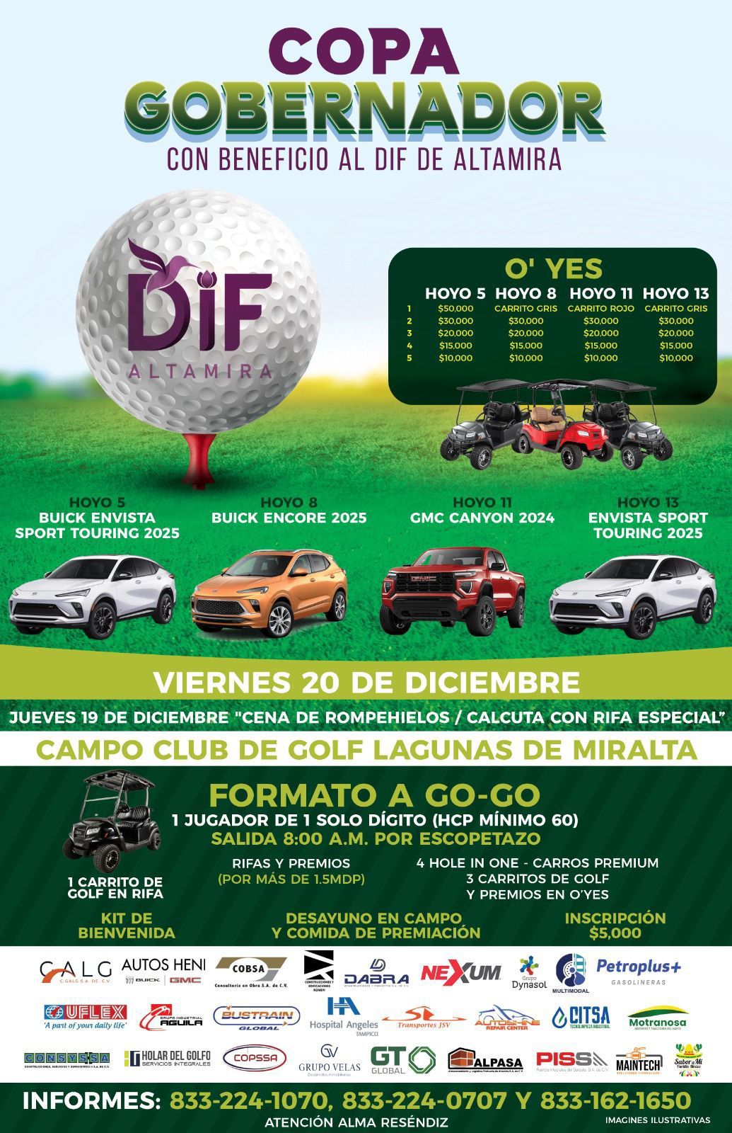 ALTAMIRA TAMAULIPAS.- Este viernes se realizará la tan esperada «Copa Gobernador» de Golf, un evento deportivo con propósito social, organizado a beneficio del Sistema DIF Altamira. La competencia se llevará a cabo en el Club de Golf Lagunas de Miralta, bajo el formato A Go-Go, que fomenta el trabajo en equipo y la sana convivencia. Esta jornada no es solo el deporte, sino el objetivo que la impulsa: apoyar la construcción de la primera Casa Hogar en el municipio.