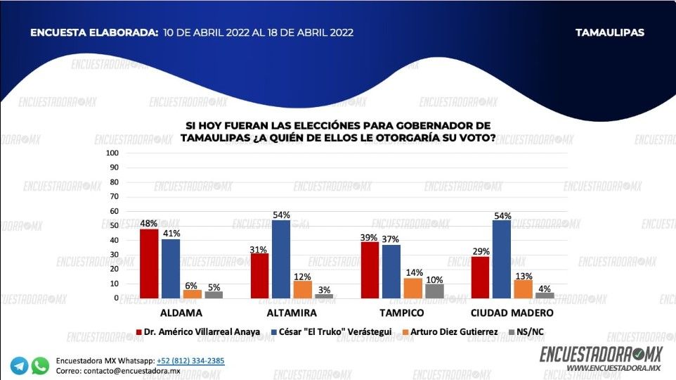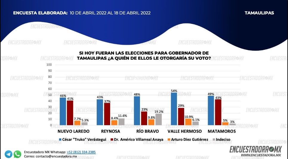 En los resultados de la encuesta por municipios, la tendencia le da la ventaja a Truko Verástegui en localidades como Laredo, Reynosa, Río Bravo, Matamoros, Altamira, Madero, Mante y González; en el resto de los municipios el candidato de la alianza Va por Tamaulipas, ha logrado disminuir el porcentaje con su más cercano competidor, quedando en un empate técnico.